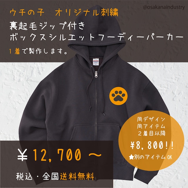 【商品の参考ページのためご購入しないでください!】 画像よりカラー・サイズのラインアップをご確認くださいませ♪ 12.7オンスのかなりしっかりした厚みのジップパーカーにお好きなデザインを刺繍します。 アウター感覚で着られる厚みのジップパーカーです! 〇サイズ・カラー違いによる価格変更はございません。 サイズ・カラーによっては一部メーカー欠品になっている場合がございます ご了承ください。 〇基本料金の刺繍サイズは最大6×6cmのワンポイントです。 (オプションでサイズアップ可能) 〇基本料金の刺繍箇所は1カ所まで(可能箇所ご確認ください) (追加料金で複数個所刺しゅう可能) ※繊維製品につき、サイズは1-2cmの誤差が出る場合があります。また色味はご使用のモニターや設定によって見え方に違いがあります。 【ボディデータ】 綿 100% 裏パイル 【ご注文方法】 おさかな産業LINE公式アカウントを友だち追加後、下記ご依頼内容をメッセージお願いします。(こちらの商品はカートに入れないでください!) 8つの項目にお答えください♪ ①デザイン画像・動物の詳しい種類(柴犬・キジトラ etc) ②モチーフ数 ※1匹=1モチーフ ※2匹以上はサイズアップ料金とモチーフ追加料金(+5,000円/匹)あり ③ウェアの種類 例)Tシャツ(レギュラー)ブラックM×2枚 ④加工位置(左胸・右袖元etc) ⑤お顔のみ or 全身(+3,500円) ⑥刺繍サイズ 6×6㎝以上はサイズアップ料金有 ⑦オプション(文字入れ・ラッピングetc) ⑧支払方法 銀行振込 or クレカ等その他支払方法(ベイスでの購入) 頂いたデータをもとにイメージ案を作成します。 修正は1回まで可能ですので、修正点全てお伝えください。 イメージ案OKでしたら専用ページを作成いたしますのでそちらよりご購入ください。 購入・ご入金確認後の製作開始となりますのでご了承くださいませ。 ※購入後のデザイン変更・キャンセルはできませんのでご注意ください! ご不明な点ありましたらLINEよりお気軽にお問い合わせくださいませ♪