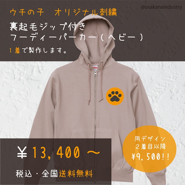 【商品の参考ページのためご購入しないでください!】 画像よりカラー・サイズのラインアップをご確認くださいませ♪ 裏起毛タイプでやわらかで軽い着心地が特徴です! 15オンスの極厚のジップパーカーにお好きなデザインを刺繍します。 アウターになるぐらいの厚みです! 〇サイズ・カラー違いによる価格変更はございません。 サイズ・カラーによっては一部メーカー欠品になっている場合がございます ご了承ください。 〇基本料金の刺繍サイズは最大6×6cmのワンポイントです。 (オプションでサイズアップ可能) 〇基本料金の刺繍箇所は1カ所まで(可能箇所ご確認ください) (追加料金で複数個所刺しゅう可能) ※繊維製品につき、サイズは1-2cmの誤差が出る場合があります。また色味はご使用のモニターや設定によって見え方に違いがあります。 【ボディデータ】 綿 80%、ポリエステル 20% 裏起毛(表糸:綿 100% オープンエンド糸) 【ご注文方法】 おさかな産業LINE公式アカウントを友だち追加後、下記ご依頼内容をメッセージお願いします。(こちらの商品はカートに入れないでください!) ※デザイン作成に約1週間、決済翌日から制作に約10営業日(土日祝除く)頂きます 8つの項目にお答えください♪ ①デザイン画像・動物の詳しい種類(柴犬・キジトラ etc) ②モチーフ数 ※1匹=1モチーフ ※2匹以上はサイズアップ料金とモチーフ追加料金(+5,000円/匹)あり ③ウェアの種類 例)Tシャツ(レギュラー)ブラックM×2枚 ④加工位置(左胸・右袖元etc) ⑤お顔のみ or 全身(+3,500円) ⑥刺繍サイズ 6×6㎝以上はサイズアップ料金有 ⑦オプション(文字入れ・ラッピングetc) ⑧支払方法 銀行振込 or クレカ等その他支払方法(ベイスでの購入) 頂いたデータをもとにイメージ案を作成します。 修正は1回まで可能ですので、修正点全てお伝えください。 イメージ案OKでしたら専用ページを作成いたしますのでそちらよりご購入ください。 購入・ご入金確認後の製作開始となりますのでご了承くださいませ。 ※購入後のデザイン変更・キャンセルはできませんのでご注意ください! ご不明な点ありましたらLINEよりお気軽にお問い合わせくださいませ♪