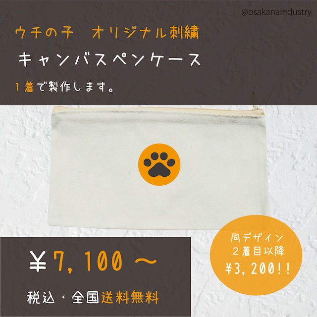 【商品の参考ページのためご購入しないでください!】 画像よりカラー・サイズのラインアップをご確認くださいませ♪ キャンバス生地のペンケースにお好きなデザインを刺繍します。 〇基本料金の刺繍サイズは最大高さ3.5cm横幅5.5㎝までのワンポイントです。 (オプションでサイズアップ可能) 〇基本料金の刺繍箇所は1カ所まで(可能箇所ご確認ください) ※繊維製品につき、サイズは1-2cmの誤差が出る場合があります。また色味はご使用のモニターや設定によって見え方に違いがあります。 【ボディデータ】 キャンバス生地 【ご注文方法】 おさかな産業LINE公式アカウントを友だち追加後、下記ご依頼内容をメッセージお願いします。(こちらの商品はカートに入れないでください!) 8つの項目にお答えください♪ ①デザイン画像・動物の詳しい種類(柴犬・キジトラ etc) ②モチーフ数 ※1匹=1モチーフのみ ③ウェアの種類 例)Tシャツ(レギュラー)ブラックM×2枚 ④加工位置とサイズ(右隅4×4㎝まで) ⑤お顔のみ ⑥刺繍サイズ 4×6㎝まで ⑦オプション(文字入れ・ラッピングetc) ⑧支払方法 銀行振込 or クレカ等その他支払方法(ベイスでの購入) 頂いたデータをもとにイメージ案を作成します。 修正は1回まで可能ですので、修正点全てお伝えください。 イメージ案OKでしたら専用ページを作成いたしますのでそちらよりご購入ください。 購入・ご入金確認後の製作開始となりますのでご了承くださいませ。 ※購入後のデザイン変更・キャンセルはできませんのでご注意ください! ご不明な点ありましたらLINEよりお気軽にお問い合わせくださいませ♪