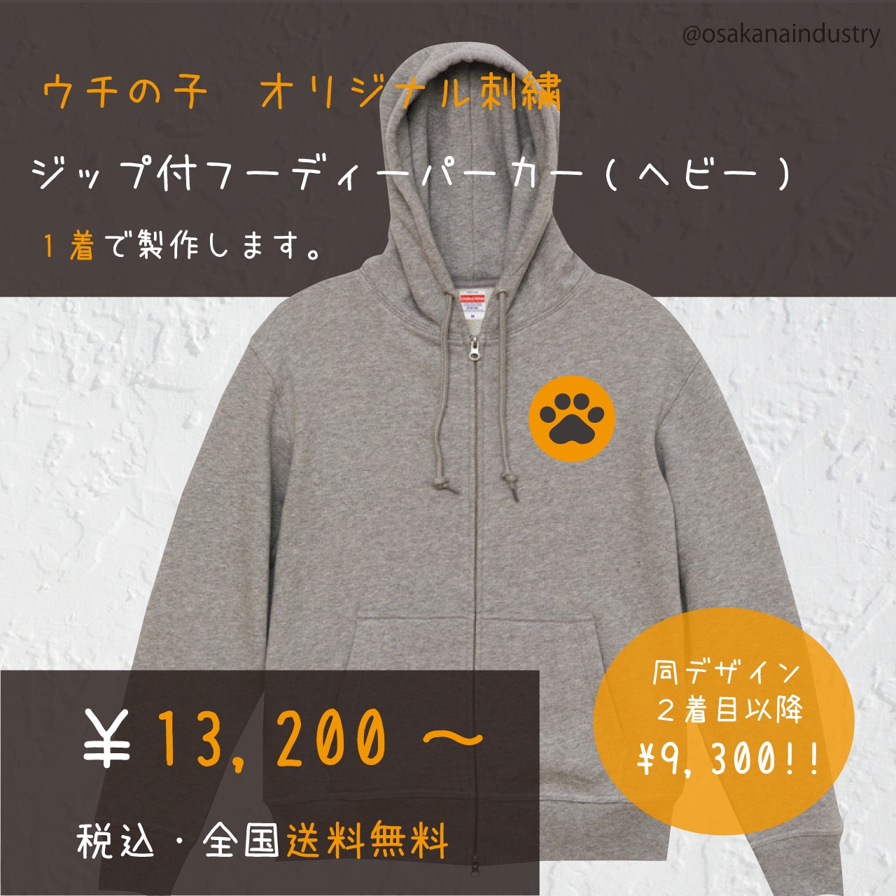 12.7オンスのかなりしっかりした厚みのジップパーカーにお好きなデザインを刺繍します。